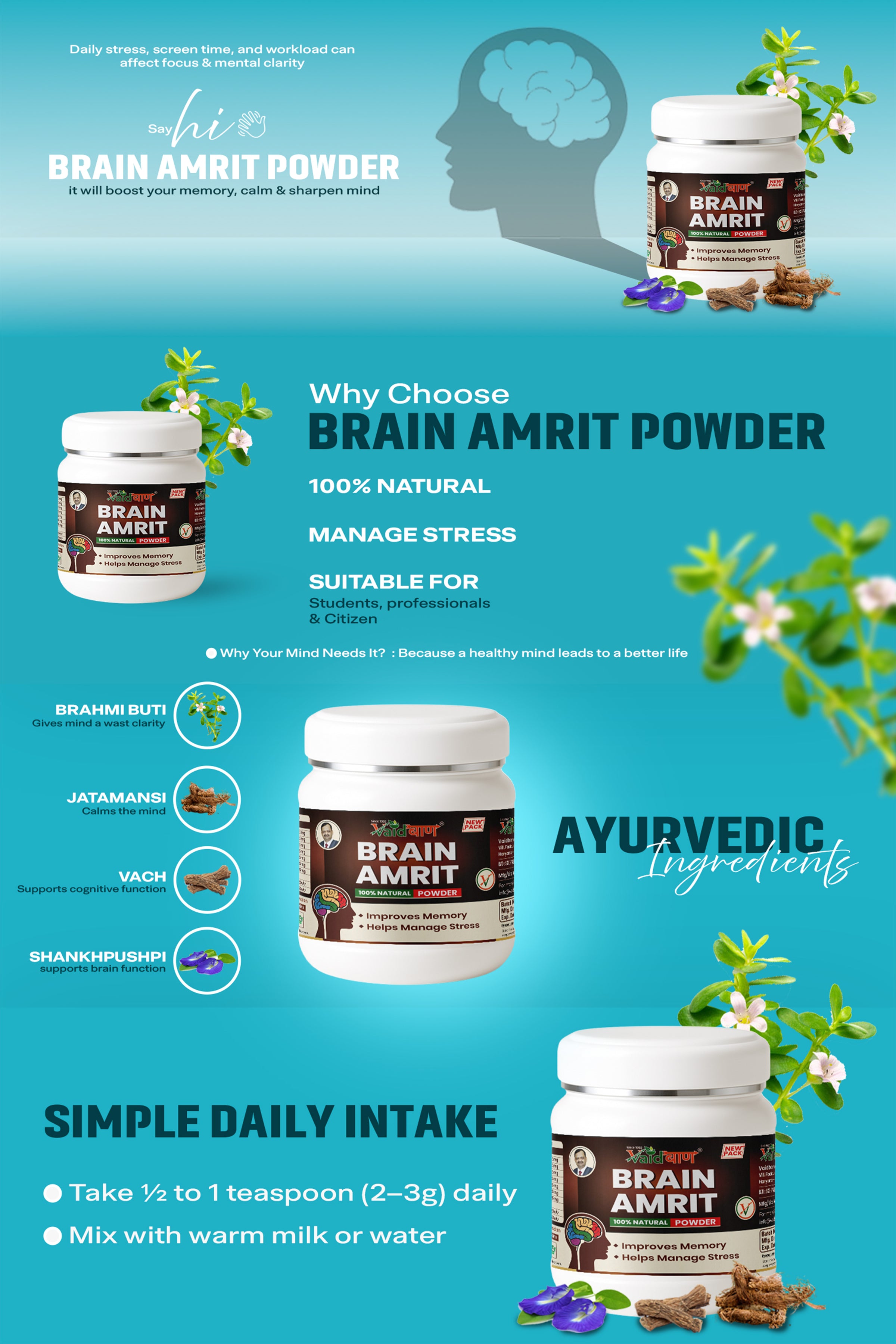 Vaidban Brain Amrit Powder – 100% Natural Ayurvedic Memory & Stress Relief Formula (250g)