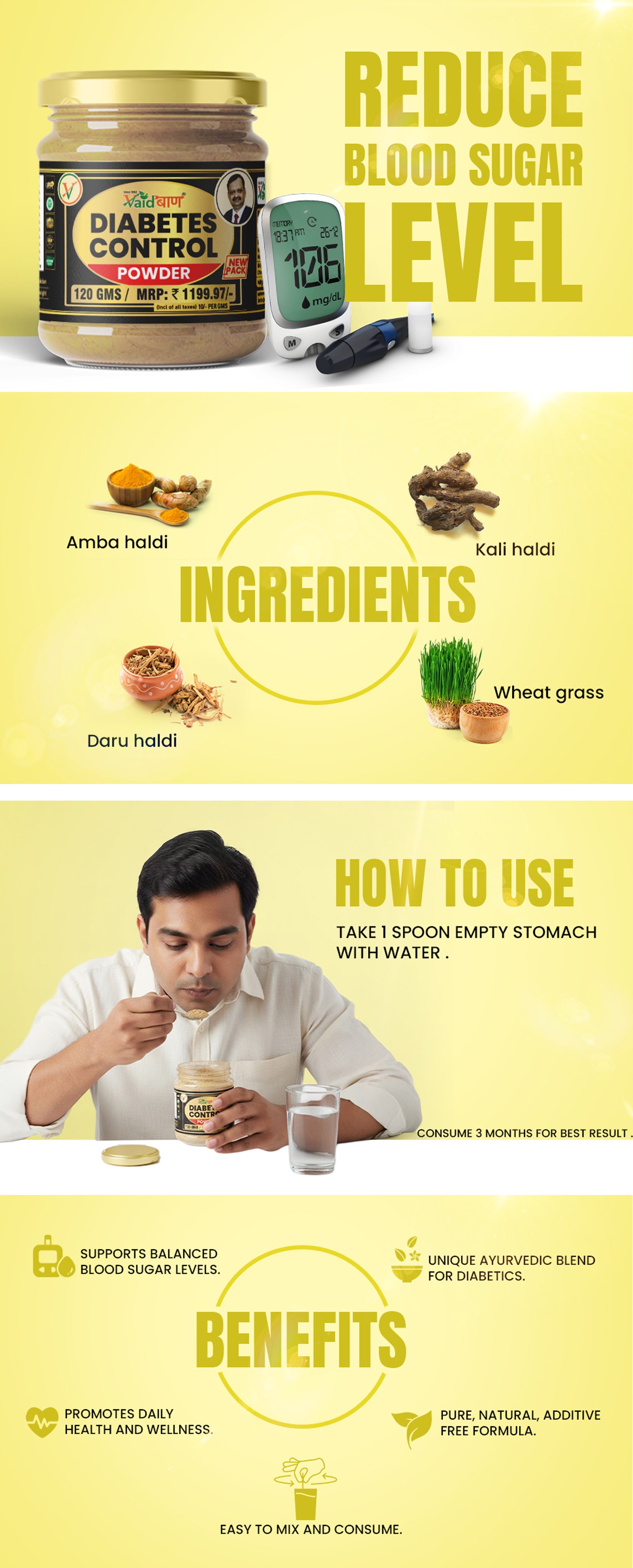 Incorporate Vaidban Diabetic Control Powder into your daily diet by mixing it with water or your preferred beverage. It's a simple yet effective way to complement your diabetes care plan, supporting overall health and wellness.