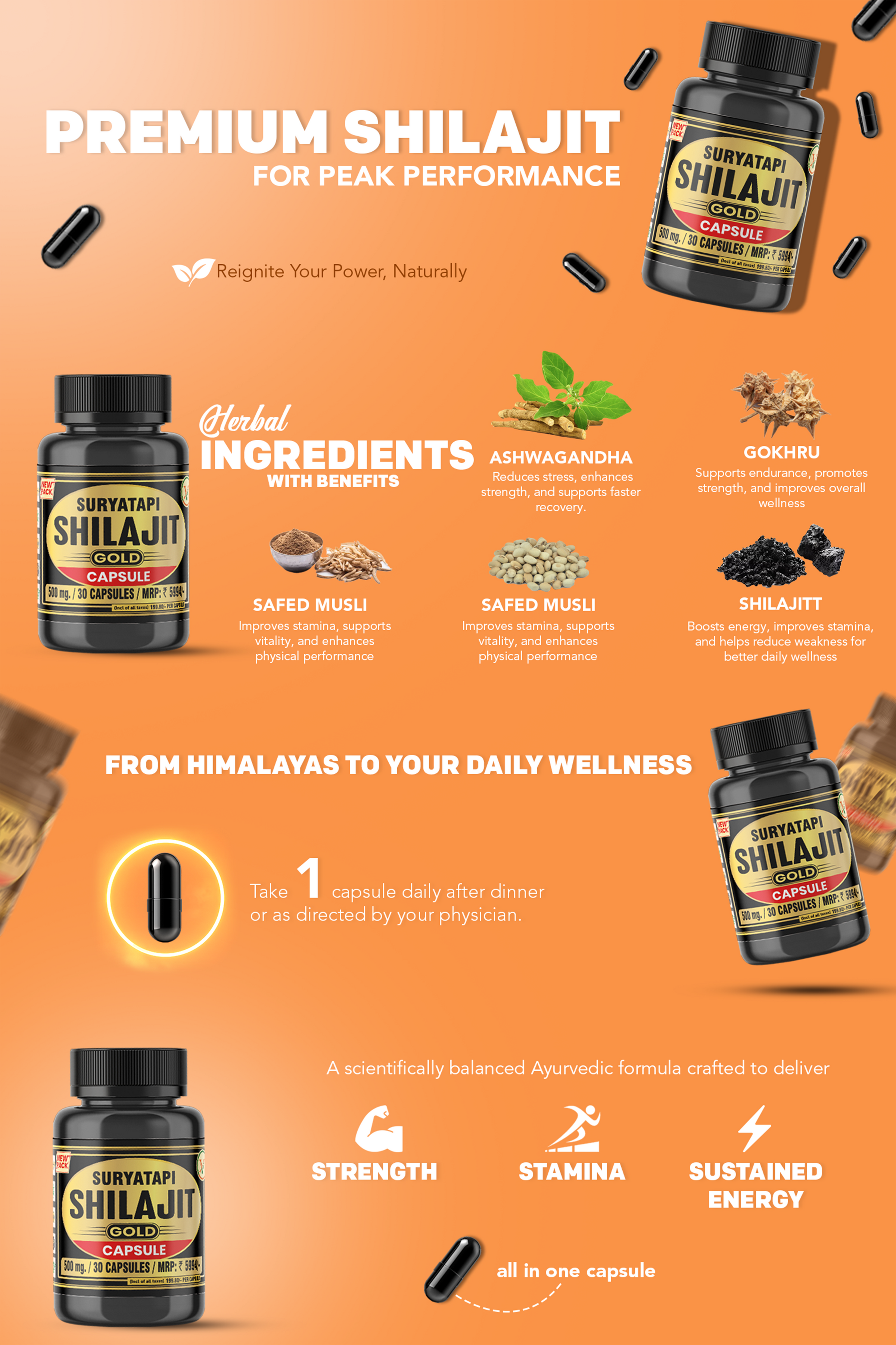 - Ayurvedic formulation designed to improve your strength, stamina, and power. If you're looking for a natural way to boost your energy levels, relieve general weakness, and support overall physical health and well-being, then Vaidban Suryatapi Shilajit Gold Capsule is perfect for you.