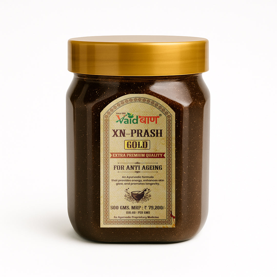 Vaidban XN-Prash Gold is a powerful Ayurvedic formula designed to enhance your energy, improve skin glow, and support healthy ageing. Rich in natural herbs, it helps boost vitality and promotes overall wellness and longevity.