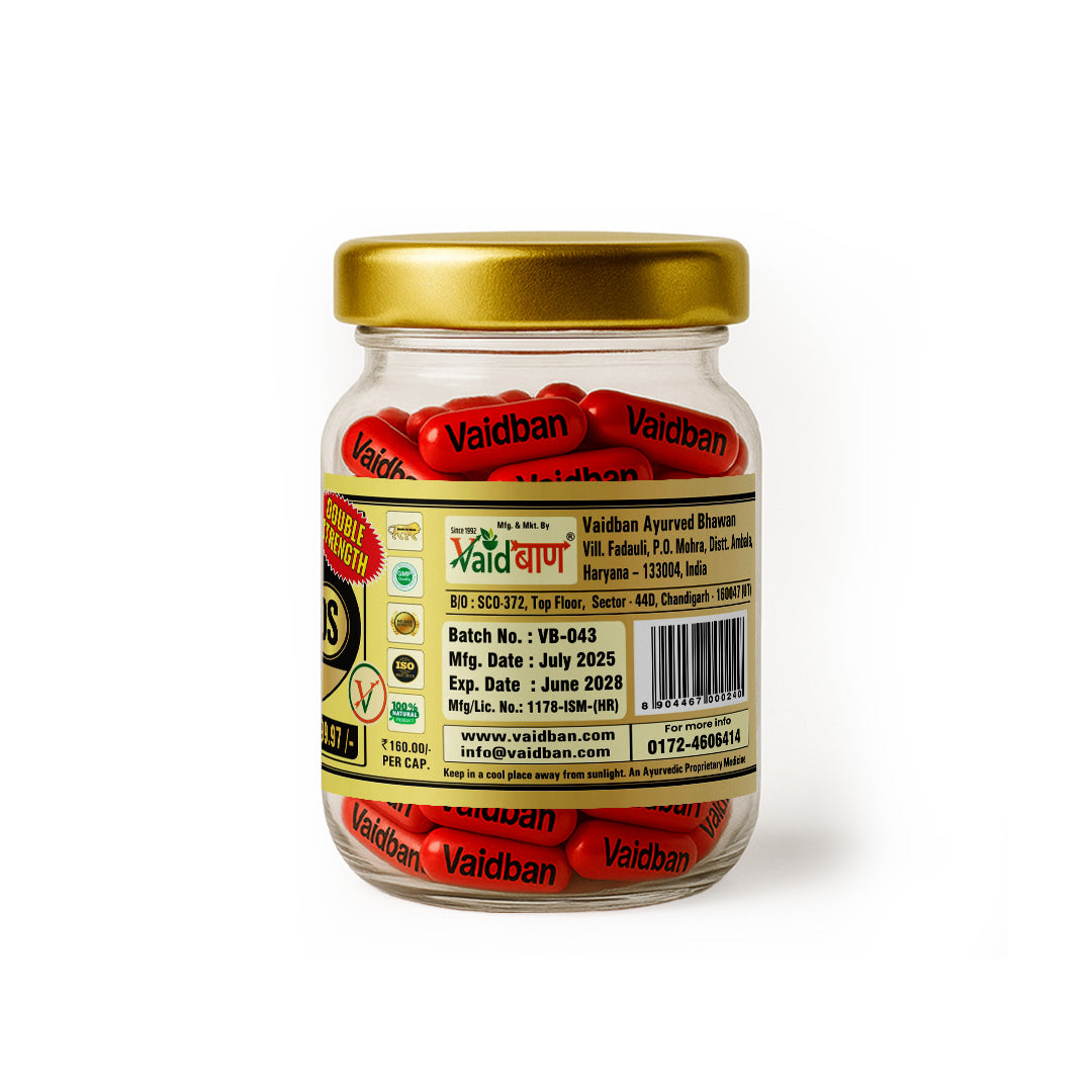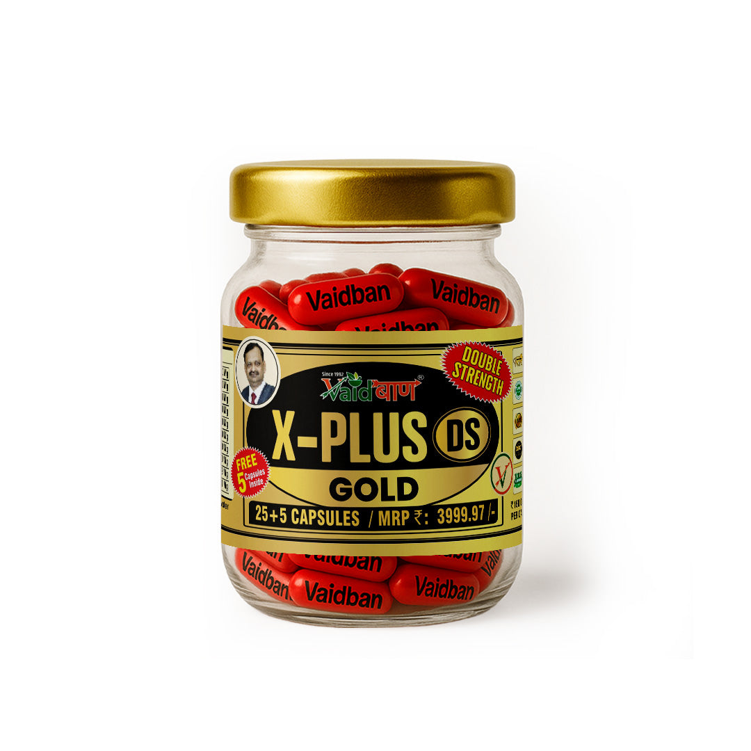 Vaidban X-Plus DS Gold is a premium double-strength Ayurvedic formulation crafted with a powerful blend of Swarna Bhasma, Basant Kusumakar Ras, Safed Musli, Ashwagandha, Shilajit, Gokshura, Giloy, and 20+ potent herbs & minerals. Designed to boost vitality, stamina, and overall well-being, these capsules are trusted for enhancing energy, improving immunity, and restoring balance naturally.