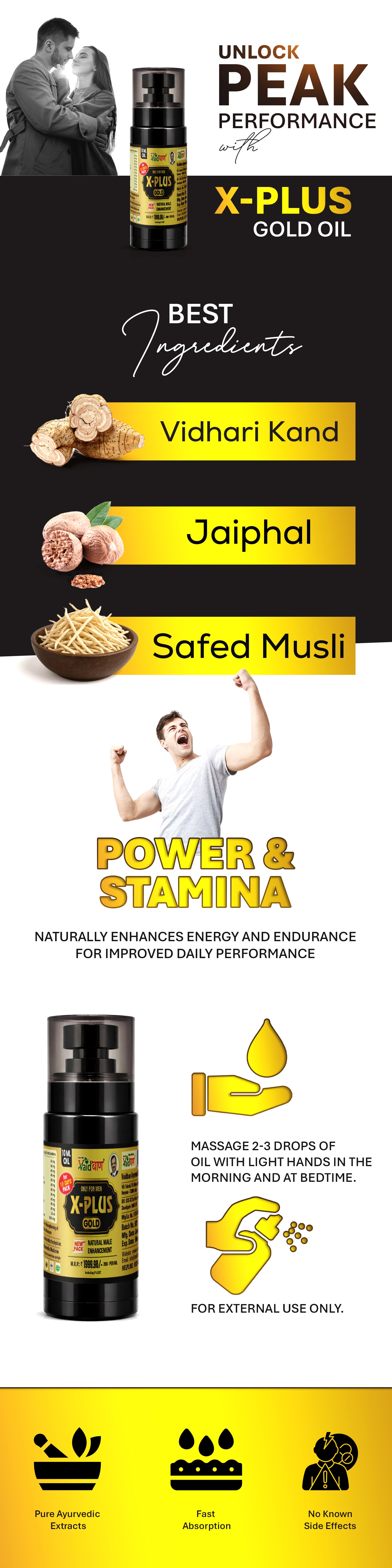 X-Plus Gold Oil is an Ayurvedic product designed to help men enhance stamina, strength, and overall performance.